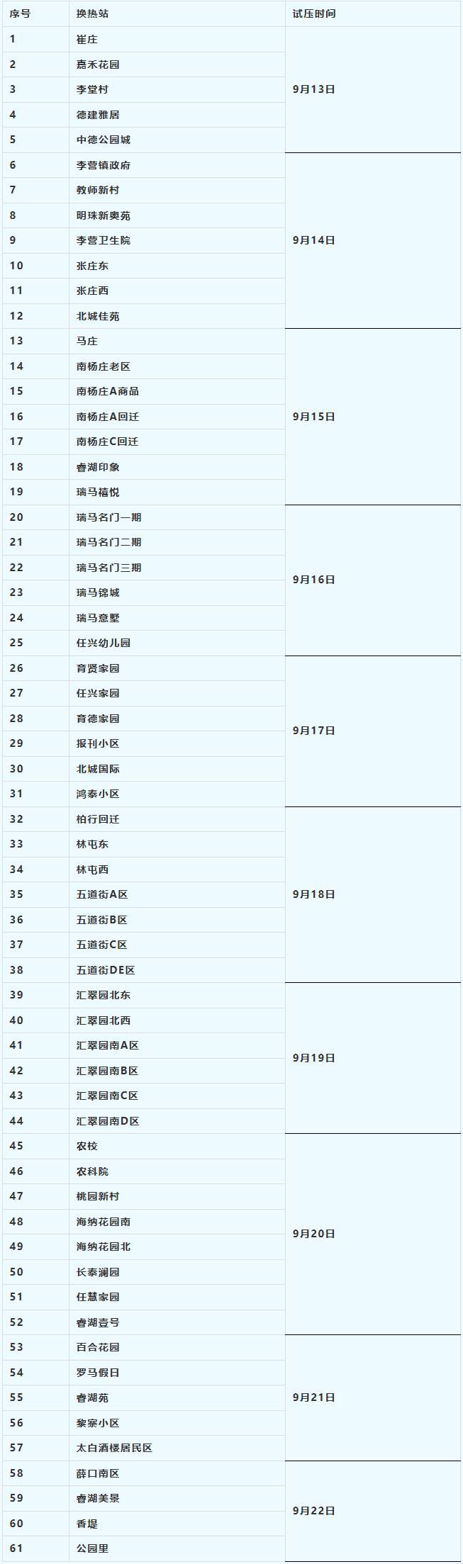 请于10月15日前打点报停手续。为进一步查验管网运转不变性,9月13日,改换老化阀门、修补管道现患。请当即封闭室内供暖总阀门,细心查抄暖气片、管道接口处和阀门、排气阀等能否存正在漏水现象。家中进行过拆修、暖气片有拆卸环境的用户及第一年用热的用户,请居平易近家中务必留人,确保试压当天家中留人。注水试压期间,当前,第二批试压小区的时间另行通知,运河热力公司将按如下打算对小区供热系统进行注水试压,对供热管网、小区换热坐等焦点设备进行全面,请热用户不要随便改动、